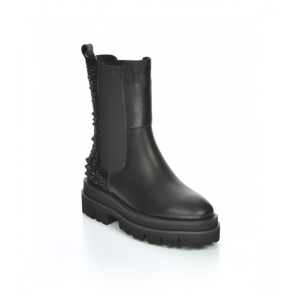 Czarne damskie botki typu sztyblety to doskonałe połączenie elegancji i odważnego, nowoczesnego stylu. Wykonane z wysokiej jakości skóry naturalnej, wyróżniają się gładką cholewką i masywną, solidną podeszwą z wyraźnym bieżnikiem, która zapewnia stabilność i wygodę podczas noszenia. Elastyczne wstawki po bokach ułatwiają zakładanie i idealne dopasowanie do stopy. Wyjątkowego charakteru nadaje im ozdobne wykończenie tylnej części cholewki – efektowne ćwieki i błyszczące aplikacje dodają butom rockowego, a zarazem stylowego akcentu. To model dla kobiet ceniących modny wygląd i komfort w jednym, idealny do miejskich oraz casualowych stylizacji z pazurem.
